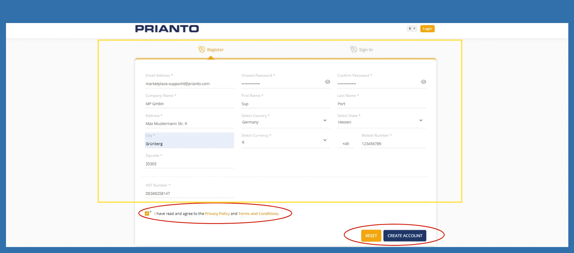 Finally mark the checkbox regarding the Privacy Policy and the Terms and Conditions. Then click on Create Account.